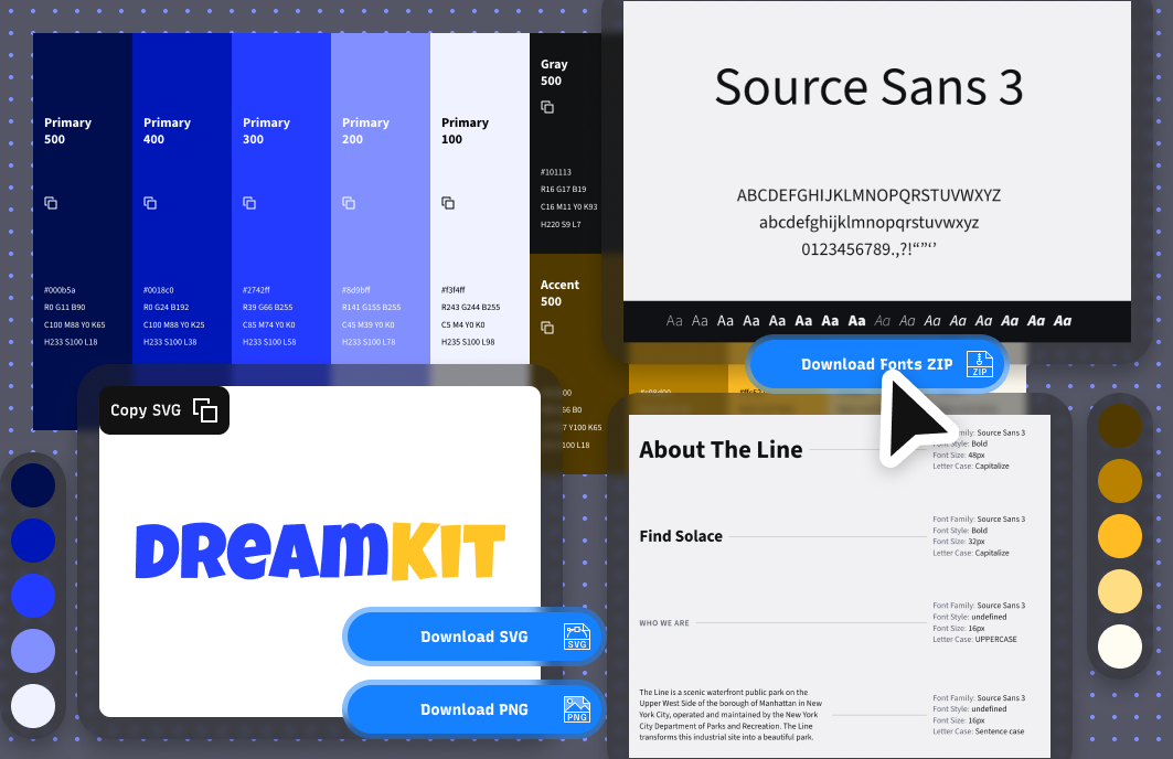 Build a brand guideline with vector logos, design elements, color palettes, and fonts. Publish it as a brand guidelines website or print it as a PDF document for easy sharing.