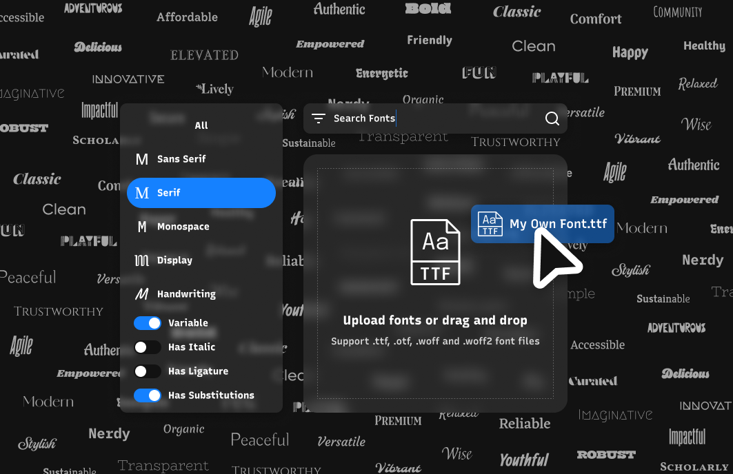 Browse a premium library of 2,735 font families. Filter by category, personality, and features like ligatures or variable settings. Upload your own fonts to explore their characteristics.