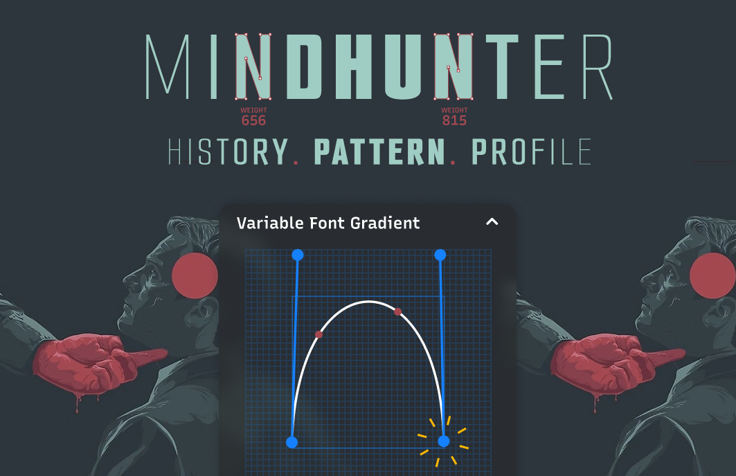This Typogram-exclusive feature lets you create visual gradients by gradually adjusting variable font settings. Use a curve editor to control how weight, width, or other variable attributes change across the text.